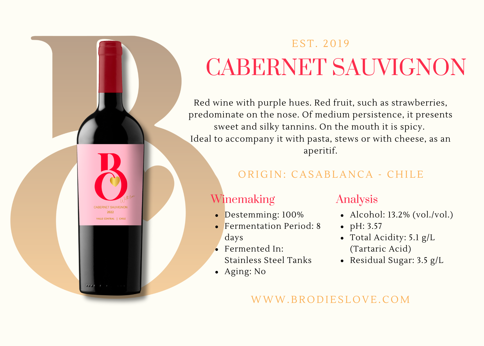 Red wine with purple hues. Red fruit, such as strawberries, predominate on the nose. Of medium persistence, it presents sweet and silky tannins. On the mouth it is spicy.